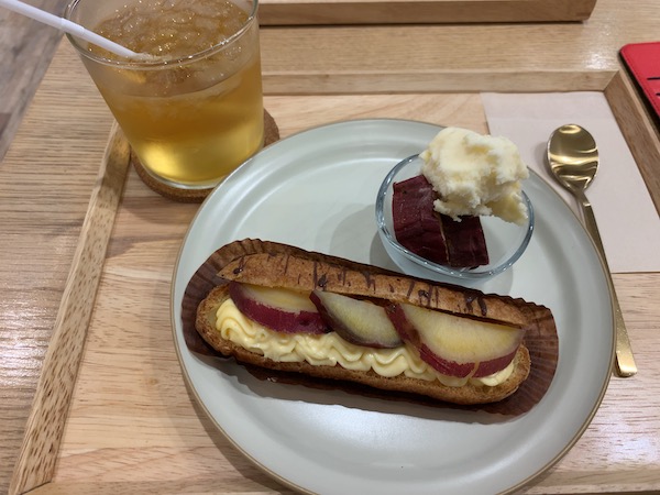 メインのスイーツはエクレアをチョイス。ミニ冷やし焼き芋とアイス、ドリンクもセットになっています。
