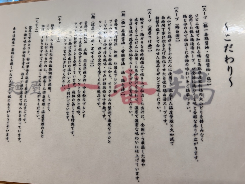 麺屋一番鶏さんの鳥は鳥取県の大山どりと鴨が使われているみたいです。