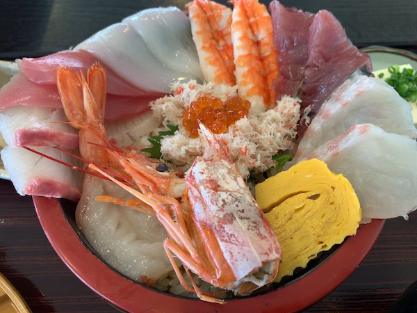 器から溢れんばかりの海鮮が乗った豪華な海鮮丼です。