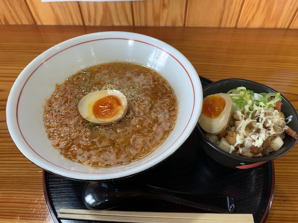 今回はエビ塩らーめん(950円)とミニチャーシュー丼(350円)を注文。