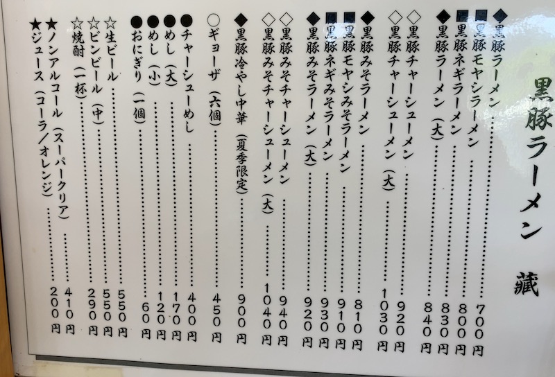 黒豚ラーメン 藏のメニュー