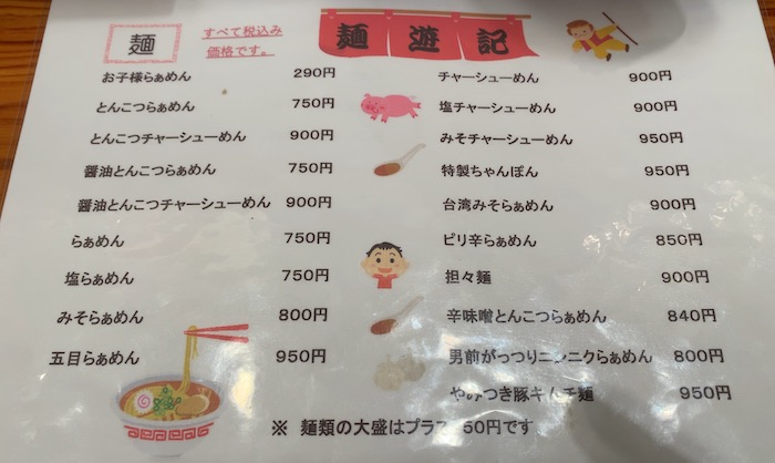とんこつらぁめん、醤油とんこつらぁめん、塩らぁめん、チャーシューめん各種。