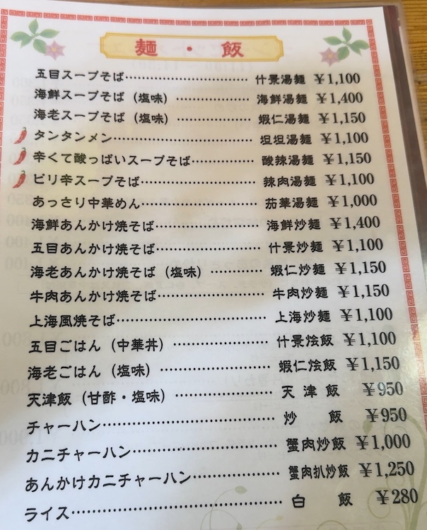 麺・飯のメニュー。