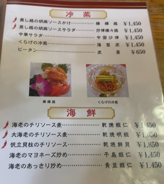 冷菜や海鮮のメニュー。