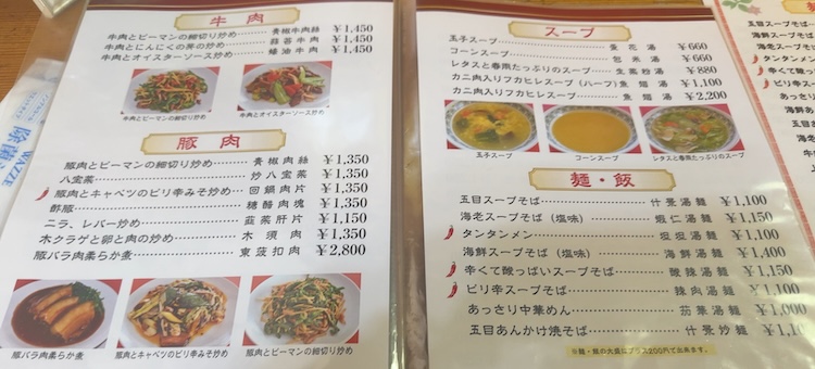 牛肉、豚肉、スープ、麺、飯のメニュー。