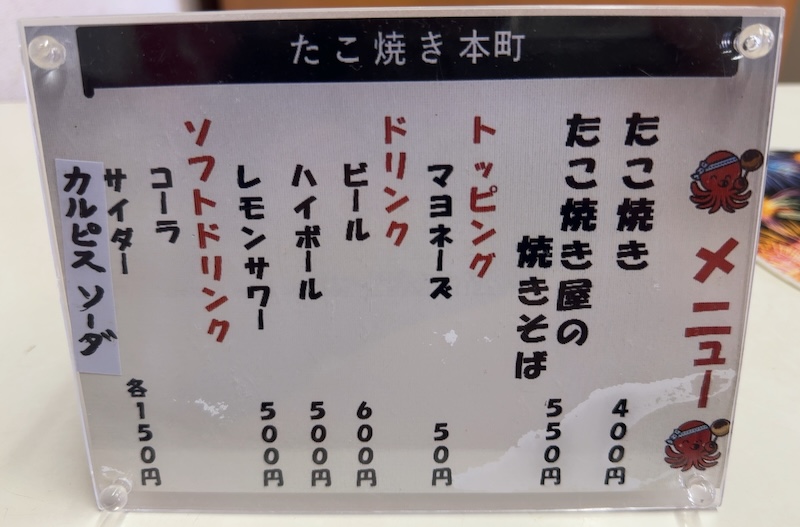 たこ焼き本町さんのメニューは”たこ焼き”と”たこ焼き屋の焼きそば”のみ。