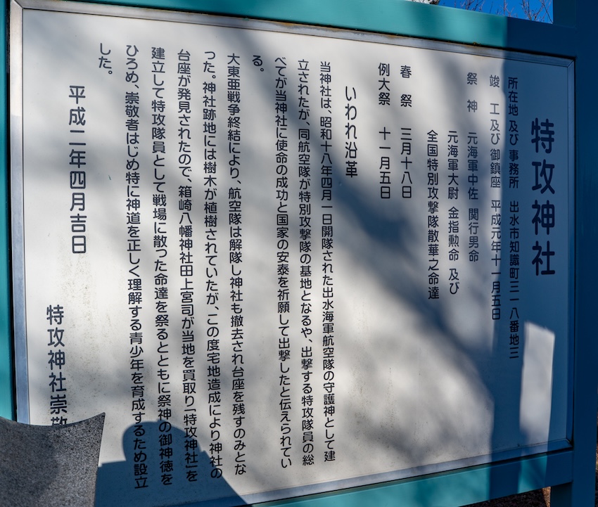 特攻神社は出水海軍航空隊の守護神として建立された神社。