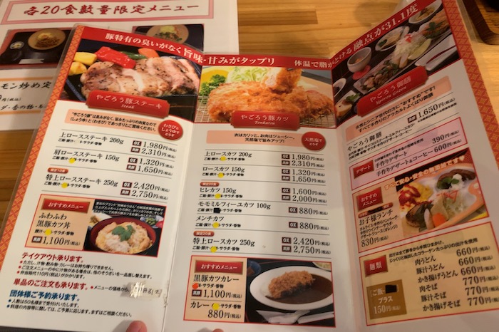 やごろう亭のメニューは”やごろう豚”というブランド豚が中心のメニュー。