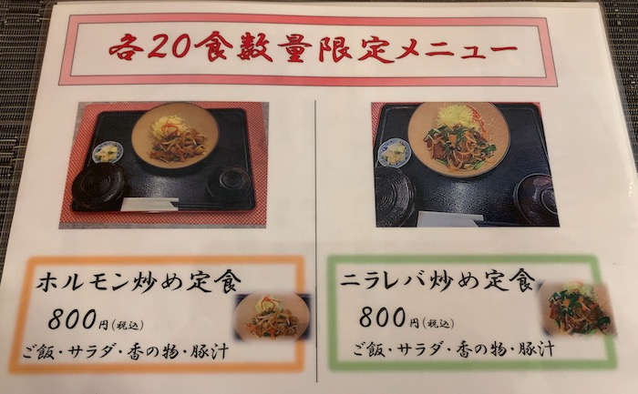 限定のランチメニューでニラレバ定食とホルモン炒め定食もありました。